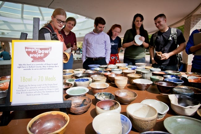 Dedicated to serving the public of Southeast Georgia and the University community, the Betty Foy Sanders Department of Art is geared toward an interdisciplinary interpretation of art and culture as it prepares students for professional careers as practicing artists and designers, or for work in other arts-related fields requiring study in the studio arts. Since 1990, ceramic students from the Department of Art have hosted the Empty Bowl Project, a service project in support of the Statesboro Food Bank. Lead by ceramics Professor Jeff Schmuki, the goal of the Empty Bowl Project is to create unique bowls and serve a simple meal in exchange for a $10 cash donation.