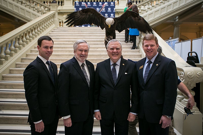 The day included appearances by Georgia Southern’s bald eagle Freedom, mascot GUS and the Georgia Southern cheerleaders, as well as a breakfast provided by Eagle Dining Services, a showcase of the University’s ROTC, nursing and STEM education programs, Herty Advanced Materials Development Center and more. Georgia Southern University President Brooks A. Keel, Ph.D., began his address on the Georgia House of Representatives floor by playing a video of the Eagles’ 26-20 football victory over the University of Florida Gators last November.
