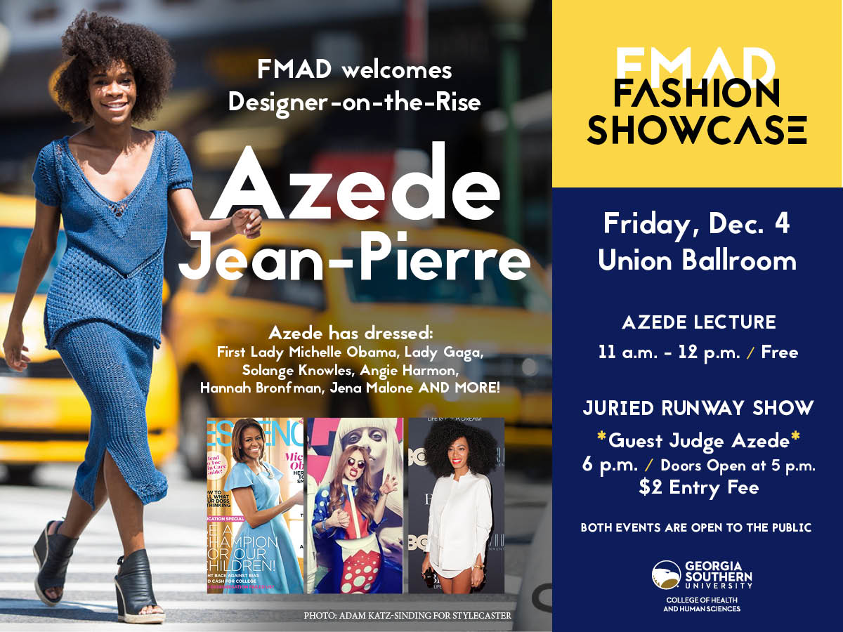 Georgia Southern University’s Fashion Merchandising and Apparel Design (FMAD) program and Fashion Menagerie, Georgia Southern’s premier fashion student organization, will host fashion designer Azede Jean-Pierre for a lecture and guest judge at the student Showcase, set for Friday, Dec. 4, in the Russell Union Ballroom. Jean-Pierre is a fashion designer whose young womenswear label is based in New York City, and has been committed to celebrating the sensual femininity of its customer since the company’s inception. Jean-Pierre was born in Pastel, Haiti, and was raised in Atlanta, Georgia. After three years as a student at Savannah College of Art and Design, she decided to launch her own label and later moved to New York City and honed her skills interning at Ralph Rucci and Ohne Titel before branching out on her own.Jean-Pierre’s collection has been picked up by Moda Operandi, Chalk Boutique in Chicago, VOD boutique in Dallas, Exodus Goods in Nola, Tinker Tailor and the brand’s online store. The label has also been featured in many major publications and has become a red carpet favorite for several very stylish and influential celebrities like Solange Knowles, Lady Gaga and First Lady Michelle Obama. Jean-Pierre will present a lecture at 11 a.m. during her visit to Georgia Southern, and will hold a question and answer session along with private critiques for senior design students at 3 p.m. She will then be a guest judge for the Showcase, set for 6 p.m. in the Russell Union Ballroom. The Showcase, which is a runway show and styling competition, includes work from current FMAD design students as well as local and student stylists and alumni. Tickets for the showcase are $2 and may be purchased at the door or in advance through Fashion Menagerie Fashion Organization.The FMAD program area, part of the College of Health and Human Sciences’ School of Human Ecology, has two areas of emphasis, fashion merchandising and apparel design. The program of study provides a broad liberal education with a focus on the diverse careers in textiles, apparel production and fashion industries. Students receive specialized training in fashion illustration, pattern making, draping design, manual and computer aided design and fashion buying. The program has been named one of the top fashion merchandising schools in the United States by fashion-schools.org. In a review that looked at more than 200 institutions and their academics, admissions, programs, faculty and other criteria, Georgia Southern ranked among the top 25 percent in the nation and made the top schools list at 49. The University was also ranked ninth on the list of Top 15 Fashion Schools in the South. Notable fashion alums: Mychael Knight – Celebrity fashion designer, Emily Bargeron – Fashion Designer Mamie Ruth, and Diane Bailey – Designer/ Owner Bailey Boys.