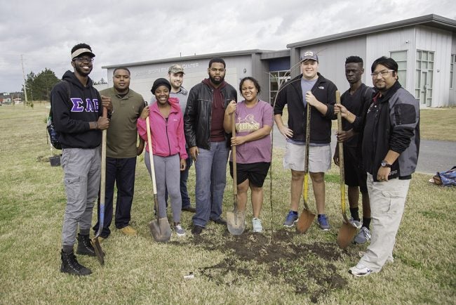 The Center for Sustainability (CfS), Division of Facilities Services and the campus community celebrated the fifth annual Arbor Day tree planting at the Shooting Sports Education Center on Wednesday, Feb. 15. Fifteen students from the Sustainable Forestry Class taught by assistant professor Subrajit Saha, Ph.D., left their legacy when they planted elm, swamp chestnut and swamp white oak trees in the green spaces surrounding the Center. University President Jaimie Hebert, Ph.D., also left his mark by planting the first tree of the day. Additional trees will be planted where they are needed most across campus in celebration of Georgia’s Arbor Day. Georgia celebrates Arbor Day on the third Friday of February each year. While the national celebration takes place in April, the subtropical climate in Georgia  is far more hospitable to plant-life earlier in the year. “It’s important on our campus to remain dedicated to sustainability,” said Hebert. “It’s part of who we are. If you look at our fundamental principles, one of those is wellness. Part of wellness is maintaining an environment that not only provides clean air and greenery but also provides a wholesome environment where people can live well. In my mind, sustainability is a significant part of our educational initiatives.” Not only are these trees impacting the University’s wellness, but they are also offering financial sustainability to the campus community. Lissa Leege, Ph.D., director for the CfS, noted the $5,000 savings annually the tree planting offers in value in terms of carbon dioxide that is sequestered,amount of oxygen available, pollution deterred, and shade provided. Saha  was proud to bring students from his class to participate in the initiative. “The importance of Arbor Day is promoting a ‘green revolution’ of sorts,” said Saha. “Students are helping the Georgia Southern community in a special way by planting these trees. When they pass by Statesboro in future years, they’ll see these grown trees and remember their part in this process.” Georgia Southern University, a public Carnegie Doctoral/Research University founded in 1906, offers more than 125 degree programs serving 20,673 students. Through eight colleges, the University offers bachelor’s, master’s and doctoral degree programs built on more than a century of academic achievement. Georgia Southern is recognized for its student-centered and hands-on approach to education. Visit GeorgiaSouthern.edu.