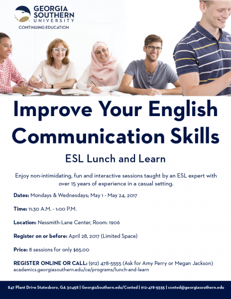 Georgia Southern’s Division of Continuing Education is excited to launch English as a Second Language community courses in a Lunch and Learn format this summer. This short-term class will offer a casual and relaxed setting for individuals who want to improve conversational and professional English language skills. Sessions will be held every Monday and Wednesday, from May 1 through May 24, from 11:30 a.m. to 1 p.m. in Nessmith-Lane Center, room 1906. Amy Perry, instructor in the English Language Program (ELP) at Georgia Southern, will hold all eight sessions for $65. Register by May 1 or on-site. Call Perry or Megan Jackson, in the Division of Continuing Education, for registration information at 912-478-5555. The University’s regular ELP is a semester-long, academic program directed toward students who wish to pursue or are already enrolled in undergraduate and graduate programs. This program continues to offer students a solid foundation on which to thrive in academic reading, writing and speaking skills. Georgia Southern University, a public Carnegie Doctoral/Research University founded in 1906, offers 119 degree programs serving 20,673 students. Through eight colleges, the University offers bachelor’s, master’s and doctoral degree programs built on more than a century of academic achievement. Georgia Southern is recognized for its student-centered and hands-on approach to education. Visit GeorgiaSouthern.edu.