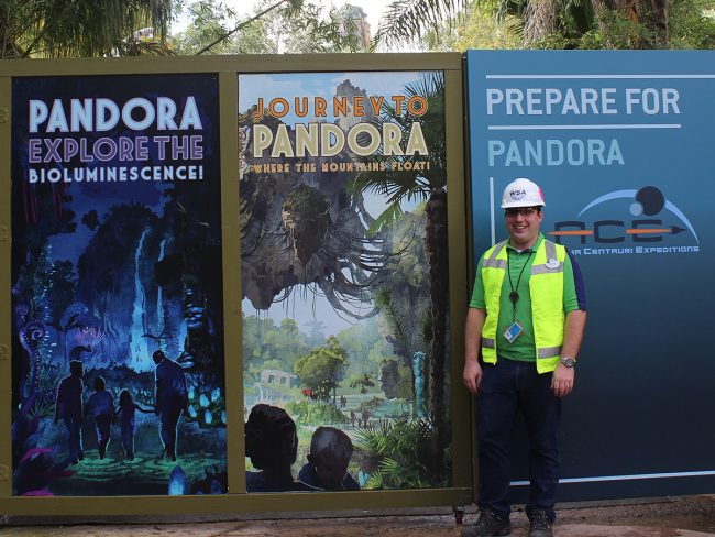 Georgia Southern alumnus Aaron Clay (’11) stands in front of the construction wall of Pandora — The World of Avatar at Walt Disney World.