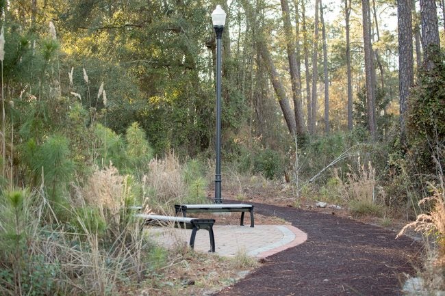 Georgia Southern University and the Statesboro community will soon be able to access campus and the Blue Mile, Statesboro’s downtown revitalization project, via a new walking trail scheduled for completion in early February.This new rubberized trail is an extension of an existing concrete trail that winds through the Herty Pines Nature Preserve and goes around J.I. Clements Stadium and the Softball Complex. The new trail will cross Beautiful Eagle Creek and tie into an existing sidewalk on Tillman Road and connect to the Blue Mile Corridor on Highway 301. “The trail includes lighting, and also fencing along the Georgia Southern Athletics practice fields,” said Matthew Shingler, director of Facilities Planning, Design and Construction at Georgia Southern. “There are a lot of faculty, staff, students and Statesboro community members who are joggers and walkers, so we hope this provides an avenue to improve the tie between the city and University.” The Blue Mile is a project aimed at upgrading and enhancing the South Main Street corridor of Highway 301 and encouraging private redevelopment of outmoded, highway-oriented commercial development into pedestrian friendly, mixed-use centers. The Blue Mile Committee is a grassroots organization made up of community leaders, volunteers and organizations.Keely Fennell, president of the Blue Mile Foundation, which helps revitalize neighborhoods along the corridor, believes it will benefit the community as a whole.“Georgia Southern was very generous in creating this trail that connects to the current trail,” she said. “It creates a walkway or easier access for students to come downtown, and hopefully it will encourage students to walk to the Blue Mile, and to eat and shop on the street.” Fennell said the Blue Mile Foundation and Committee are grateful to the University for supporting the revitalization efforts of the Blue Mile and downtown area and for funding the new trail. “Georgia Southern has been very instrumental in the entire Blue Mile endeavor and has encouraged economic development in our community,” she said. The walking trail project began in the winter of 2017, Shingler said, and is scheduled for final completion by Feb. 2. The city of Statesboro was named one of America’s Best Communities in the America’s Best Communities competition in 2017. As one of three winners, Statesboro received $1 million to help revitalize the South Main corridor.