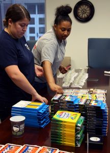 Brandi Jackson (right) and her roommate pack classroom starter kits.