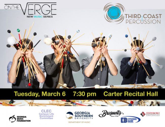 Grammy-winning quartet Third Coast Percussion will grace the stage at Georgia Southern’s Carol A. Carter Recital Hall on the Statesboro Campus, March 6 at 7:30 p.m. The University’s Department of Music, in partnership with Garrison School for the Arts in Savannah, Georgia, will host the Chicago-based ensemble as part of its “On the Verge” new music series. “The mission of ‘On The Verge’ is to introduce audiences in southern Georgia to art music of the 20th and 21st centuries,” said Associate Professor of Music Martin Gendelman, DMA. “Third Coast Percussion is a leader in the nation when it comes to presenting contemporary works of percussion music, naturally, and therefore, a perfect match for our series.” Since 2012, “On the Verge” has made southern Georgia a regular stop for some of the finest contemporary art musicians in the United States including performers like Blair McMillen, Jorge Variego, Dancing Heart and SaVaSa Trio. Third Coast Percussion was invited to be part of the series for their unique style of performance and interaction with their audiences. According to their website, a direct connection with the audience is at the core of all of Third Coast Percussion’s work, whether the musicians are speaking from the stage about a new piece of music, inviting the audience to play along in a concert or educational performance, or inviting their fans around the world to create new music using one of their free mobile apps. For more than 10 years, Third Coast Percussion has forged a unique path in the musical landscape with virtuosic, energetic performances that celebrate the extraordinary depth and breadth of musical possibilities in the world of percussion. In addition to their performance, the group will also lead outreach activities for students at the Georgia Southern Campus and the Garrison School for the Arts campuses on March 5. Admission for this event is free thanks to the kind sponsorship of the Georgia Music Foundation, Braswell’s Food Company, Statesboro Properties and Citizens Bank, as well as the Campus Life Enrichment Committee and the College of Arts and Humanities at Georgia Southern. For more information on the “On the Verge” series, visit http://cah.georgiasouthern.edu/music/areas-2/composition/on-the-verge/. Georgia Southern University, a public Carnegie Doctoral/Research institution founded in 1906, offers 142 degree programs serving more than 27,000 students through nine colleges on three campuses in Savannah, Statesboro, Hinesville and online instruction. A leader in higher education in southeast Georgia, the University provides a diverse student population with expert faculty, world-class scholarship and hands-on learning opportunities. Georgia Southern creates lifelong learners who serve as responsible scholars, leaders and stewards in their communities. Visit GeorgiaSouthern.edu.