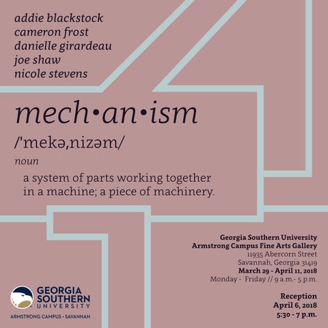 The Department of Art at the Georgia Southern University Armstrong Campus will host undergraduate Spring 2018 Senior Exhibitions during March and April in the Fine Arts Gallery in Savannah.“Mechanism: Five Different Parts Working Together as a Whole,” a cohesive art exhibition designed by five Georgia Southern senior art students, will be on display at the Fine Arts Gallery on the Armstrong Campus March 28 through April 11. An artist talk and reception will be held Friday, April 6, 5:30-7 p.m.“Mechanism” is all about mediums coming together to give the audience an exciting experience. Artists will display art forms in photography, ceramics and graphic design, all melded together to encourage audience interaction and provoke thought. Seniors Addie Blackstock, Cameron Frost, Danielle Girardeau, Joseph Shaw and Nicole Stevens have combined their best artwork for this unique show. Each artist has used their unique background and artistic experience to add different components to the exhibit.“It is an artist’s job to offer the world their perspective,” said Frost. “I seek to show the world the element of fire in a humanized form.”Stevens added, “It is valid to say that the full potential of a piece of work is sometimes only visible through the process of its destruction. By destroying my art, I am able to have a liberating experience by letting go.”The exhibit is free and open to the public. The Fine Arts Gallery will be open from 9 a.m. to 5 p.m. throughout the exhibition. Georgia Southern University, a public Carnegie Doctoral/Research institution founded in 1906, offers 141 degree programs serving more than 27,000 students through nine colleges on three campuses in Statesboro, Savannah, Hinesville and online instruction. A leader in higher education in southeast Georgia, the University provides a diverse student population with expert faculty, world-class scholarship and hands-on learning opportunities. Georgia Southern creates lifelong learners who serve as responsible scholars, leaders and stewards in their communities. VisitGeorgiaSouthern.edu.