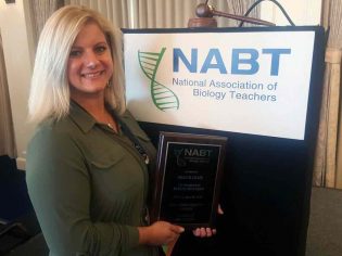 Amanda Glaze, Ph.D., assistant professor of science education at Georgia Southern University, recently received the national Evolution Education Award at the National Association of Biology Teachers (NABT) National Conference in San Diego.  Sponsored by the Biological Sciences Curriculum Study (BSCS) center and the BEACON Center for the Study of Evolution in Action, the Evolution Education Award recognizes classroom teaching and community education efforts to promote the accurate understanding of biological evolution. The award is rotated between a K-12 teacher and undergraduate educator and includes a cash award, recognition plaque and a complimentary membership to NABT. “Beacon and BSCS are huge names in science education and are dedicated heavily to the promotion of scientific literacy as well as accurate and meaningful teaching of science in classrooms across levels,” Glaze said. “Being selected at the national level and recognized for my work in evolution education is a huge honor because I am highly aware of the phenomenal community of researchers in this field and the incredible work that is being done to impact science teaching and learning as it relates to evolution.” Glaze focuses her research on evolution education and the intersections of science and society that come into play with acceptance and rejection in the U.S. When speaking about her research, she always informs the audience of her religious upbringing in rural Alabama, laying the groundwork for how she finds passion in both her faith and the sciences. “The idea that we must choose one or the other is a false dichotomy,” Glaze said. “What is necessary, however, is an understanding of both science and religion as distinct from each other, a sort of cognitive segregation, if you will.” Glaze has been invited to speak at numerous conferences and engagements including the Smithsonian Institution’s Broader Social Impacts Committee annual meeting and a guest speaker at the HudsonAlpha Institute for Biotechnology. Colleagues and current students contributed to Glaze’s nomination. They highlighted her passion for science education, specifically evolution understanding, and recognized her unique position as a common ground for a controversial topic. “In a field where many of us have worked on the front lines we have seen the teaching of evolution as an us-versus-them battle, Dr. Glaze arrived on the scene and has helped to fundamentally transform how evolution education is approached, especially in the southern United States,” a colleague wrote. “By having a genuine understanding of both sides, she is uniquely positioned to become the bridge builder that the evolution education community in the southern U.S. (and beyond) desperately needs.” A student of Glaze’s wrote, “The way she talks to people, how she is able to have meaningful and powerful conversations with anyone, regardless of where they stand on evolution, is her superpower.” Glaze added that it is an honor to work with organizations such as NABT whose support and investment in science provide a “ripple effect,” helping to amplify the research and message of an individual such as herself to the broader community. “My research is centered around empowering teachers to teach evolution and students to have access to learning opportunities surrounding evolution,” Glaze noted. “Since evolution is such a touchy topic and is highly politicized due to the conflict perceived by the public, this directly impacts teacher effectiveness, accuracy in teaching of science and ultimately science literacy. All of these areas are part of the mission and vision of NABT. The support of organizations such as NABT brings together active minds that share in the vision for improving science literacy for all students.” Georgia Southern University, a public Carnegie Doctoral/Research institution founded in 1906, offers 141 degree programs serving nearly 26,500 students through nine colleges on three campuses in Statesboro, Savannah, Hinesville and online instruction. A leader in higher education in southeast Georgia, the University provides a diverse student population with expert faculty, world-class scholarship and hands-on learning opportunities. Georgia Southern creates lifelong learners who serve as responsible scholars, leaders and stewards in their communities. Visit  GeorgiaSouthern.edu.