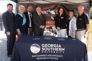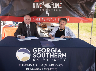 Georgia Southern Provost and Vice President of Academic Affairs Carl L. Reiber Ph.D., and Nine Line Foundation President Megan Hostler signed a memorandum of understanding at the Armstrong Campus’ Sustainable Aquaponics Research Center.
