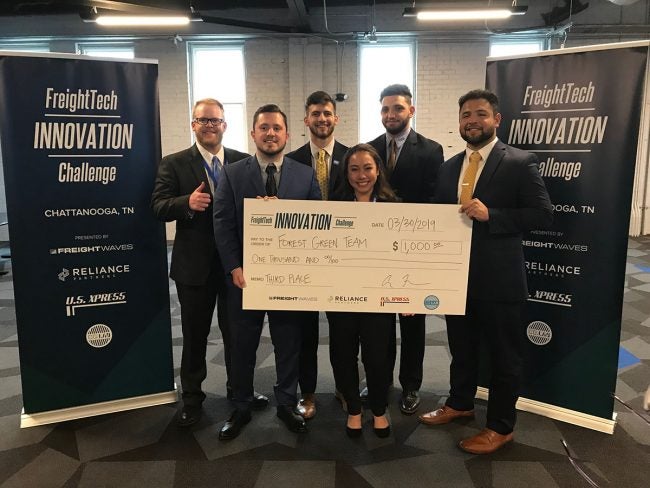 A team of Georgia Southern University logistics students placed third out of 14 schools and received $1,000 in the first-ever FreightTech Innovation Challenge in Chattanooga, Tennessee, in March. The FreightTech Innovation Challenge, organized by logistics industry leaders FreightWaves and CO.LAB and sponsored by Reliance Partners and U.S. Xpress, is a 24-hour transportation and logistics use case competition. Students spent two days working to solve challenges facing the transportation and logistics industries with the chance to win cash prizes and find potential employers. Marc Scott, Ph.D., assistant professor of logistics, said the feedback the team received from the judges set this 24-hour case challenge apart from others our logistics students have participated in previously. “This was a unique opportunity for our students to get great feedback from industry leaders in solving time-sensitive problems that real supply and logistics companies face on a daily basis,” said Scott. The students were tasked with finding transportation and logistics solutions based on a fictitious customer looking to expand its operations throughout the Southeast. With FreightWaves’ SONAR technology system, a first-of-its-kind freight market data and analytics platform, the student teams proposed ideas to help find the most efficient and cost-effective transportation and logistics solutions for the customer. Throughout the case competition, students were able to ask SONAR market experts and coaches from various corporate sponsors to help them solve the case, according to Jeff Mason, managing director of alliances of FreightWaves. “I am impressed with the level of talent among the college students competing in this challenge,” stated Mason. “It was hard to pick a winner because they are all going to be successful. I would hire every one of them.”