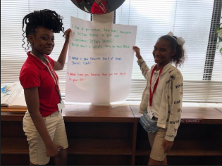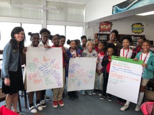(l-r) Anne Katz, Ph.D., associate professor of reading in the College of Education’s Department of Curriculum, Foundations and Reading, and Vivian Bynoe, Lane Library interim head of reference and instruction, who together secured a National Endowment for the Humanities grant, stand with Hubert Middle School students in the Great Stories Club.