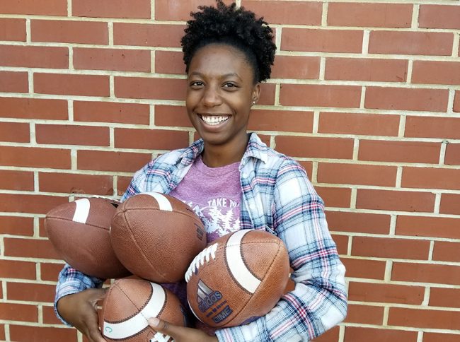 Then, a personal friend created a replica of the oversized can she’ll toss footballs into during the competition. After reaching out to her professors, McKeever-Harrison secured a space at Hanner Fieldhouse to store the replica and practice as often she wanted. Georgia Southern Athletics helped her secure footballs to practice with, and she has even perfected her tossing strategy with help from Georgia Southern football legend Adrian Peterson.