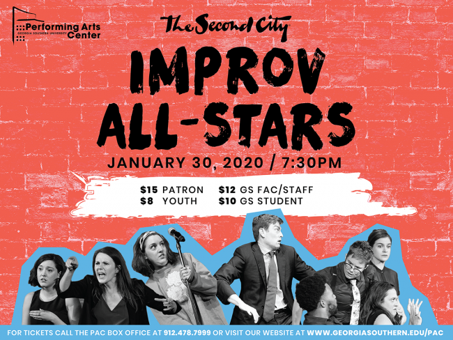 Chicago’s storied theater comedy troupe, “The Second City: Improv All-Stars,” will stage an irresistible hour of unscripted comedy performed by the industry’s up-and-coming talent at the Performing Arts Center (PAC) at Georgia Southern, as part of the center’s 2019-2020 Main Stage Series, on Thursday, Jan. 30, at 7:30 p.m.