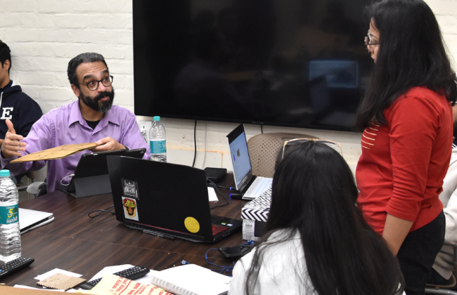 Dominique Halaby, director of Georgia Southern’s FabLab and Business Innovation Group, left, works with students from the National Institute of Design in India to create sustainable packaging prototypes.