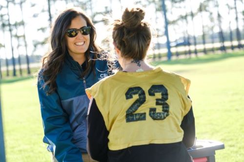 Jenna Morogiello, coordinator of injury prevention and care at Campus Recreation and Intramurals, chats with a student on the field.