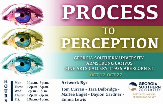 The Georgia Southern University Betty Foy Sanders Department of Art is hosting the multidisciplinary exhibition, “Process to Perception,” which will showcase the work of graduating seniors on the Armstrong Campus and will run from Oct. 12 through 27 at the Fine Arts Gallery.