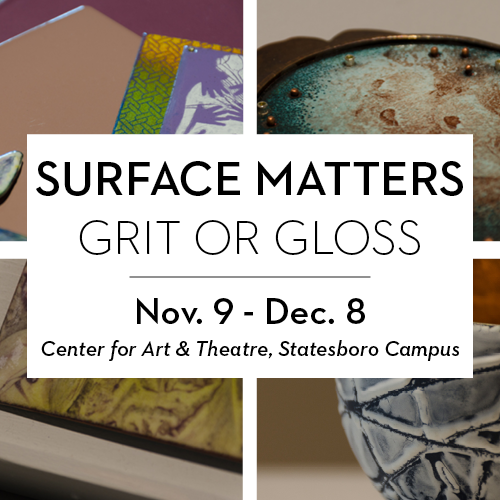 “Surface Matters: Grit or Gloss” is now open at the Center for Art and Theatre on the Georgia Southern Statesboro Campus until Dec. 8. The exhibition features more than 60 enamel-based artworks by nearly 50 artists from around the world. A virtual Artists’ Talk will be held on Zoom on Nov. 18 from 5:30 to 7 p.m.