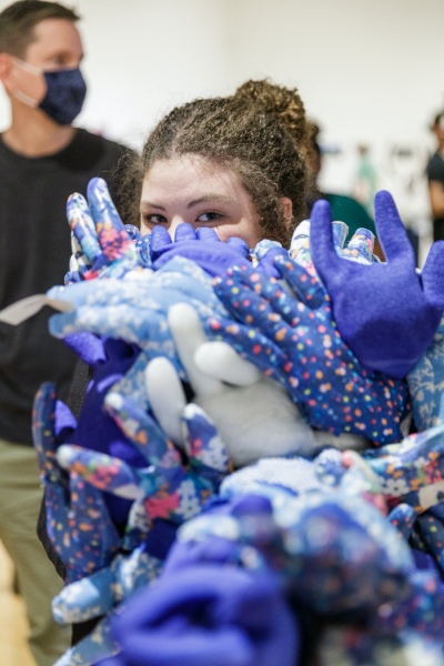 Caitlin Ceccotti, a first-year studio art major, was awarded first place for her mixed media wearable sculpture “Internal Conflict.” Breannan Gamez, a junior 2D studios major, received second place for her work “Wood and Metal Necklace.” Eva Wilcher, a sophomore art education major, earned third place with her fabric piece titled “Handsy.”