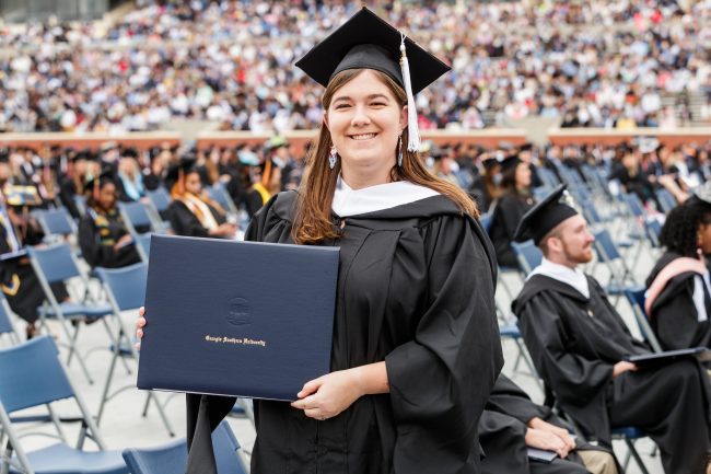 Watrous completed her bachelor’s degree during the COVID-19 pandemic, studying history, anthropology, and women’s, gender and sexuality studies. Now earning her master’s degree, she crossed the stage at Paulson Stadium for the first time on May 9. Following commencement, she will move to Albany, Georgia, where, just one week after graduating, she will begin work as the lead educator for the Thronateeska Heritage Center.