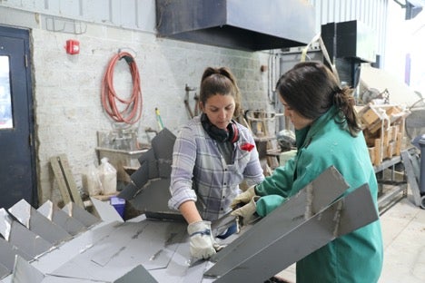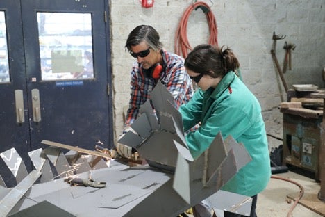 Alongside her fellow students in Assistant Professor Casey Schachner’s 3D Art and Design Foundations classes, she was to use a 6-by-6-inch square piece of paper to create a three-dimensional object. Students could cut and fold the paper, but they could not remove or reattach pieces of paper. The paper submissions were juried by art and community representatives, and eight were selected to be translated into full-steel sculptures.