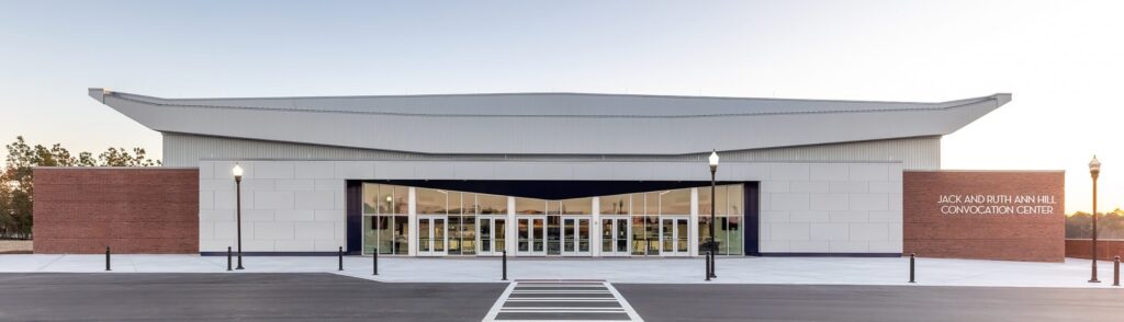 Construction for the Jack and Ruth Ann Hill Convocation Center began in early 2023 and finished late 2024. The program manager for the project is BDR Partners; the architect/engineer is LS3P-AECOM; the site/civil engineer is Hussey, Gay, Bell; the mechanical engineer is Dulohery Weeks; the general contractor is Whiting-Turner. Additional partners are GSFIC and Board of Regents USG.