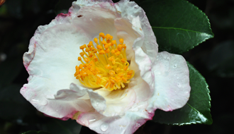 The Camellia Garden, located in front of Jenkins Hall on the Armstrong campus, was established to test the landscape potential of camellia species grown along the Georgia coast. We optimistically assumed that since Camellia japonica and Camellia sasanqua grow so well here, at least some of the 280 other species of camellia would thrive as well. Our 28,000-square-foot garden contains over 50 species of camellia, along with an interesting complement of camellia relatives, including the genera Eurya, Franklinia, Gordonia, Polyspora, Schima, and Ternstroemia.