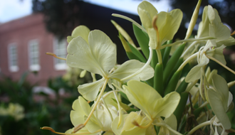 The Ginger Garden, located on the Armstrong campus at the south end of Hawes Hall, contains plants belonging exclusively to the Zingiberaceae family.