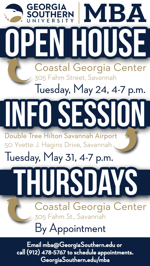 The Georgia Southern College of Business will hold several events this month to promote the accelerated MBA offered in Savannah. Working professionals interested in making an investment that will benefit their careers should plan to attend one of the events.