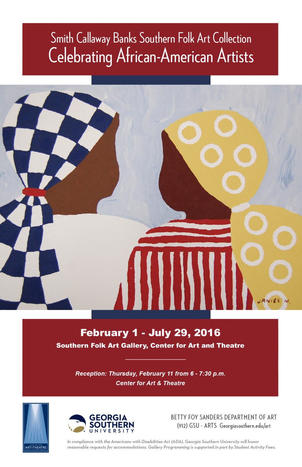 Georgia Southern University’s Betty Foy Sanders Department of Art (BFSDoArt) presents Celebrating African-American Artists, featuring work created by renowned African-American artists from the South. On display through July 29 in the Southern Folk Art Gallery of the Center for Art & Theatre, the exhibition includes a reception Feb. 11 at 6 p.m. at the Center for Art & Theatre. The events are free and the public is welcome.